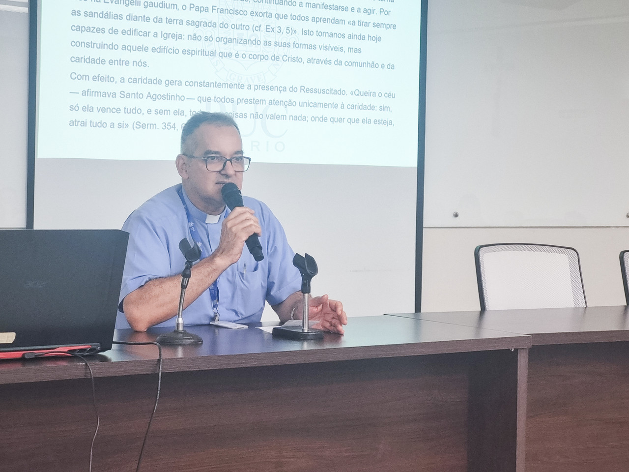 Durante o encontro, o Coordenador de Graduação, Pe. Heitor Utrini, apresentou informações importantes sobre a organização do curso, abordando temas como atividades complementares, estágio, extensão universitária e outros aspectos fundamentais para o percurso formativo dos estudantes.